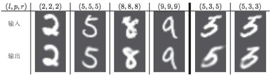 3 个路由迭代的 CapsNet 的样本 MNIST 测试重构。(l,p,r)分别表示标签、预测和重构目标。最右边的两列表示一个失败案例的两个重构,它解释了模型是如何混淆在图像中的 5 和 3 的。其他的列都是由正确的分类获得的,它表明模型选取了细节而平滑了噪声。