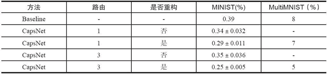 此表为 CapsNet 分类测试精度,MNIST 均值和标准差结果由 3 次试验获得。