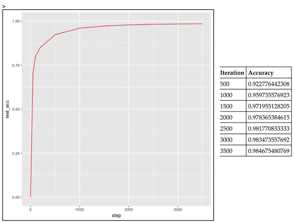 看一下精确度的提高情况。经过 500 次迭代达到 92%,在 3500 次迭代中达到 98.46%: