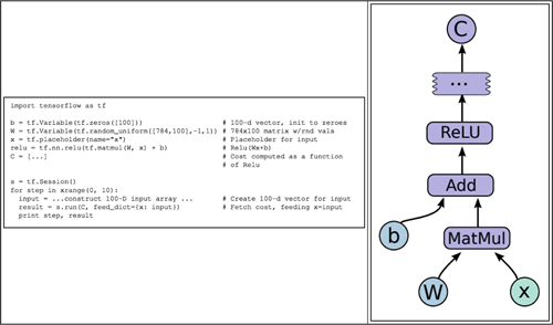 考虑其中包含的一些示例,可以在下面的图片中看见,左侧显示的是TensorFlow代码片段,右侧显示的是对应的图表: