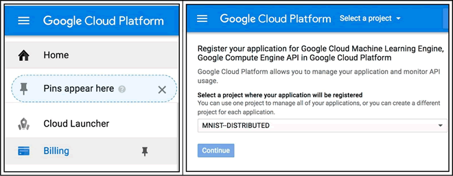 通过在云控制台的左侧导航栏中选择相关的语音来为此项目启用计费,然后为项目启动 Compute Engine(计算引擎)和 Cloud Machine Learning APIs(云机器学习 API):