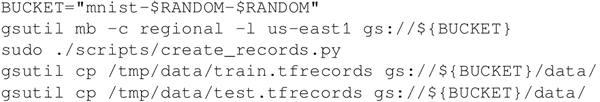 有多个处理 MNIST 数据的 worker,所以最好的办法是创建一个在所有 worker 之间共享的存储桶,并复制这个桶中的 MNIST 数据: