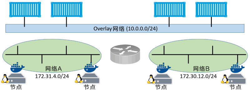 Docker 主机通过两个底层网络相连,而容器则通过覆盖网络相连。对于同一覆盖网络中的容器来说,即使其各自所在的 Docker 主机接入的是不同的底层网络,也是互通的。