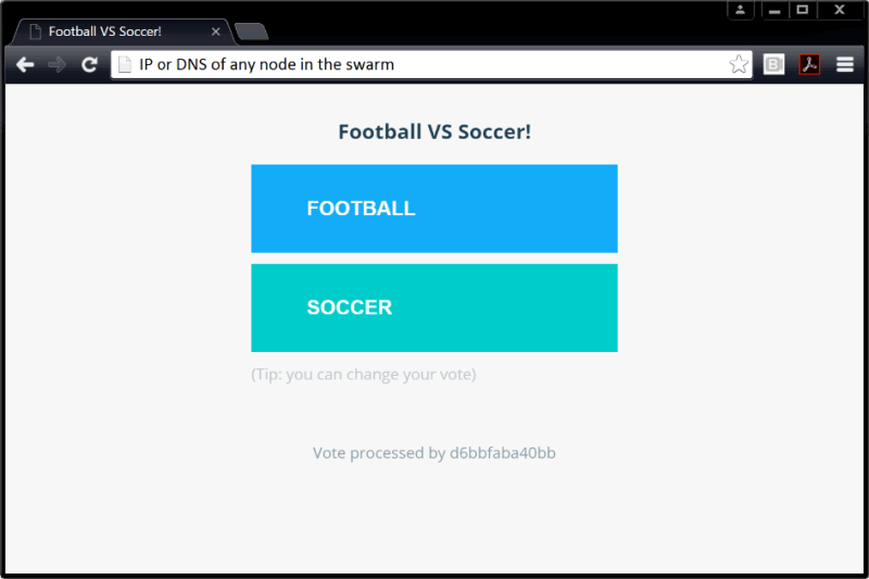 如上图所示,这是一个简单的投票程序,它能够注册对“footbal”或“soccer”的投票。可随意在浏览器中使用其他节点的 IP,均能够打开该页面,因为 -p 80:80 参数会在所有 Swarm 节点创建一个入站模式的端口映射。