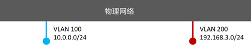 假设有一个物理网络,其上配置了两个 VLAN——VLAN 100:10.0.0.0/24 和 VLAN 200:192.168.3.0/24,如下图所示。