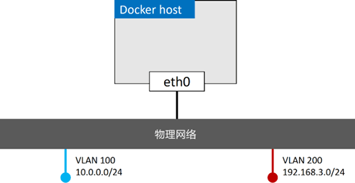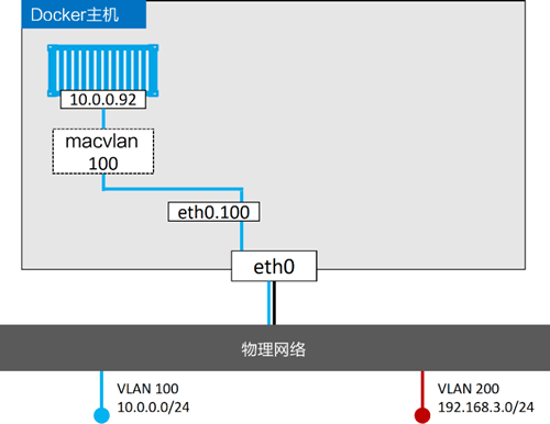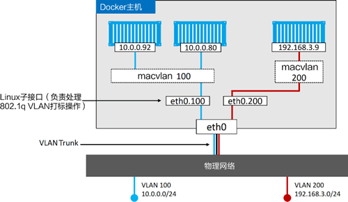 Macvlan 采用标准 Linux 子接口,需要为其打上目标 VLAN 网络对应的 ID。在本例中目标网络是 VLAN 100,所以将子接口标记为 .100(etho.100)。