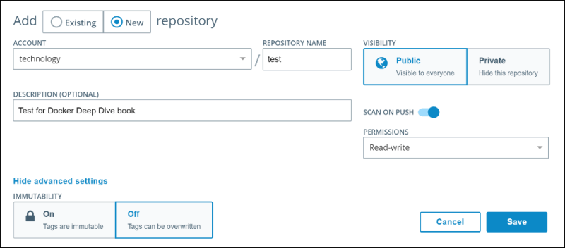 在 technology 组织下创建的新镜像库命名为 test。将其配置为公开(Public),开启推送时扫描(SCAN ON PUSH),并分配读 / 写(Read-write)权限。具体配置如下图所示。