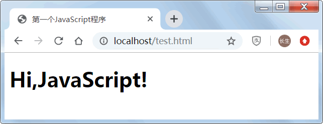 在 JavaScript 脚本中,document 表示网页文档对象;document.write() 表示调用 Document 对象的 write() 方法,在当前网页源代码中写入 HTML 字符串"<h1>Hi,JavaScript!</h1>"。第5步,保存网页文档,在浏览器中预览,显示效果如图所示。