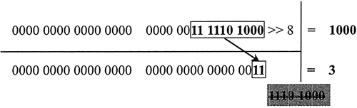 “>>”运算符执行有符号右移位运算。与左移运算操作相反,它把 32 位数字中的所有有效位整体右移,再使用符号位的值填充空位。移动过程中超出的值将被丢弃。把数值 1000 向右移 8 位,则返回值为 3。