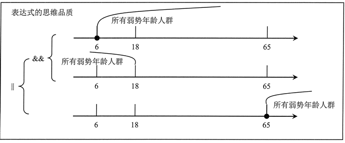 如果再设计一个更复杂的表达式:筛选所有弱势年龄人群,以便在购票时实施半价优惠。如果使用表达式来描述,就是年龄大于等于 6 岁,且小于 18 岁,或者年龄大于等于 65 岁的人。