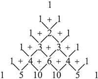 定义两个数组,数组 1 为上一行数字列表,为已知数组;数组 2 为下一行数字列表,为待求数组。假设上一行数组为 [1,1],即第二行数字。那么,下一行数组的元素值就等于上一行相邻两个数字的和,即为 2,然后数组两端的值为 1,这样就可以求出下一行数组,即第三行数字列表。求第四行数组的值,可以把已计算出的第三数组作为上一行数组,而第四行数字为待求的下一行数组,以此类推。实现代码