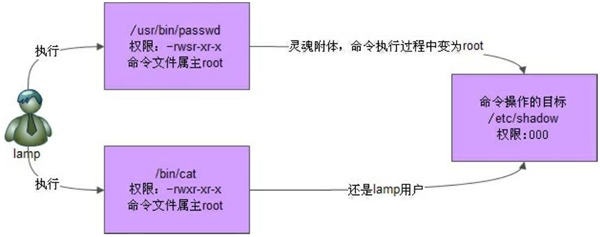 本节开头已经显示了 passwd 命令的权限配置,可以看到,此命令拥有 SUID 特殊权限,而且其他人对此文件也有执行权限,这就意味着,任何一个用户都可以用文件所有者,也就是 root 的身份去执行 passwd 命令。