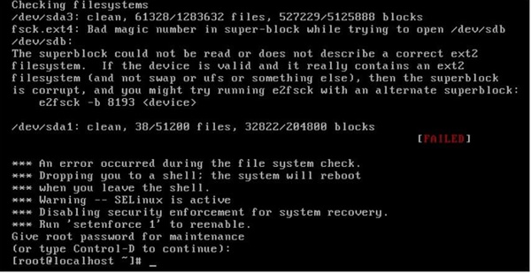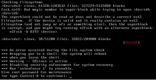 我们又看到了系统提示符,赶快把 /etc/fstab 文件修改回来吧。又报错了,如图 3 所示。