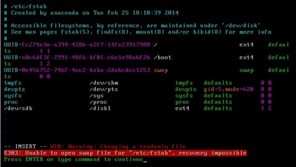 图 3 修改 /etc/fstab 报错