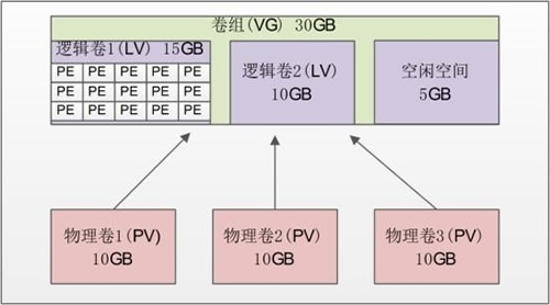 - 把物理卷整合为卷组(VG)。卷组就已经可以动态地调整大小了,可以把物理分区加入卷组,也可以把物理分区从卷组中删除。