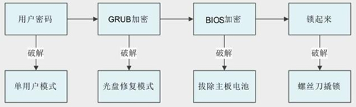 不过,GRUB 加密是可以通过进入光盘修复模式,直接删除 GRUB 配置文件中的 password 行而被破解的。接着我们又想到,进入光盘修复模式,是需要通过光盘启动系统的,那么我们给 BIOS 加密,这样就必须输入正确的 BIOS 密码,才能修改光盘的启动顺序。但是 BIOS 加密是可以通过拔除主板电池而删除的。那我们只能把服务器机箱锁起来,但只是一把锁而已,完全可以被螺丝刀撬开!